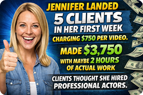 Real Example: Jennifer landed 5 clients in her first week charging $750 per video. Made $3,750 with maybe 2 hours of actual work. Clients thought she hired professional actors.